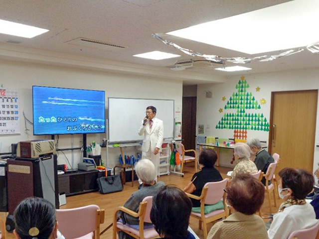 「12月13日、六本木明菜氏によるクリスマスコンサートをプラチナルームご入居者さまへ、スイートルームご入居者さま向けには12月20日、麻生慎二氏によるクリスマスコンサートを開催しました。両日ともに、懐かしい歌やクリスマスソングに耳を傾け、一緒に歌い、皆さまが楽しい時を過ごされていました」